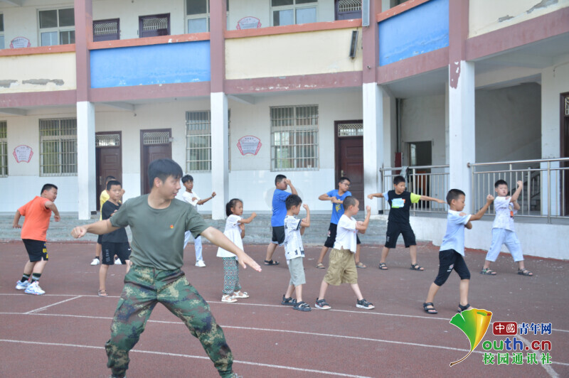 图为志愿者带领小朋友们练习军体拳(来自格林斯公司) 中国青年网通讯员 涂思清 摄