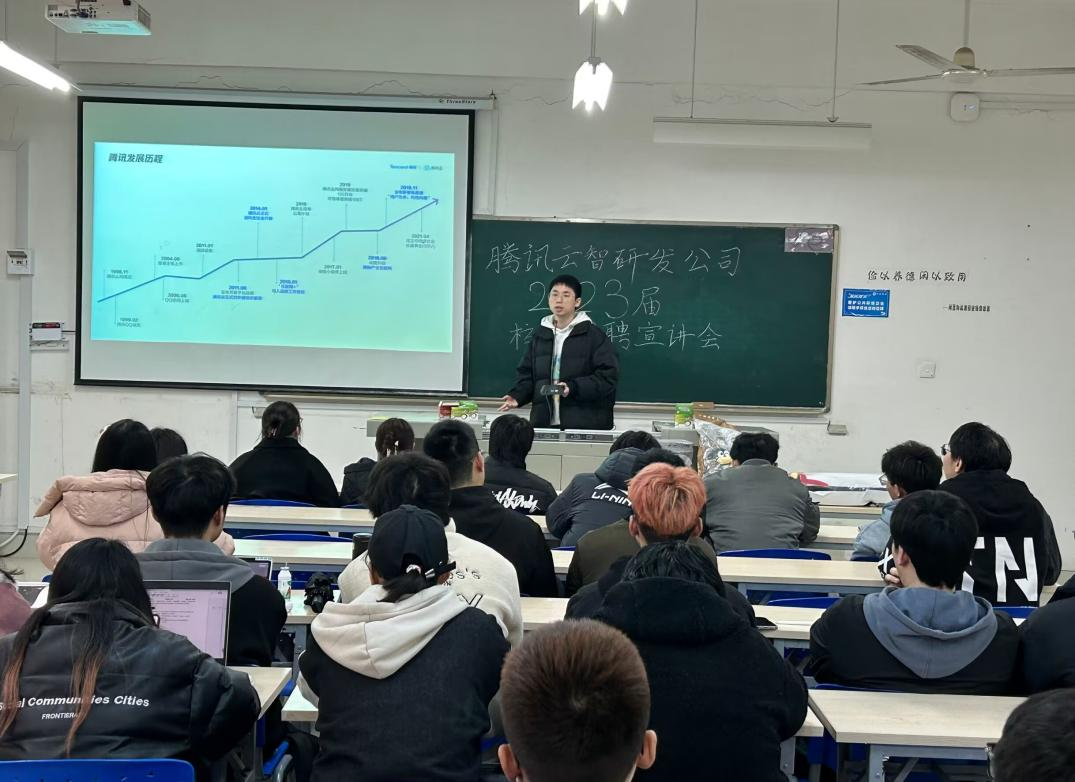宣讲会上,严轲经理感谢公司领导与老师对本次宣讲会的大力支持。随后,他对腾讯云智的创立背景、公司文化、发展历史,主要业务、招聘岗位、工作地点、晋升通道等方面进行介绍,详细讲解了公司岗位详情、工作氛围、员工福利等方面的情况。严轲表示在互联网时代构建云生态、云业务,更顺应时代的发展,响应了国家数字经济建设的号召。会上,严轲回答了同学们关心的春招流程、实习生转正、笔试面试等一系列问题,他表示,腾讯云智一向致力于新生力量的培养,会对在校生免费提供云从业资格培训,请大家踊跃报名。