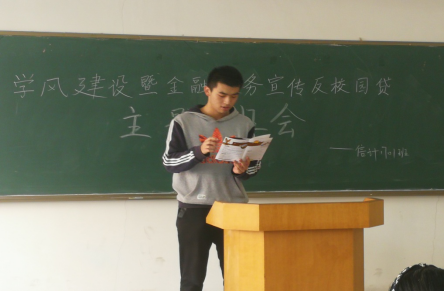 各班主讲人首先分发了金融服务的宣传手册,组织每位同学现场认真学习手册,并列举一些不良网贷实例,使同学们对非法金融贷有更深刻的认识。随后,班长号召同学们要学会理性消费,不要随意通过网络平台借贷,从而陷入网贷危机。紧接着班主任发言,他们结合以往校园非法贷的案例,向同学们解释非法校园贷的风险及危害,提出老员工在生活中要勤俭节约,提高自我保护意识,远离非法校园贷,并建议同学们在遭遇经济困难时,应该通过正规合法途径走出经济困境。