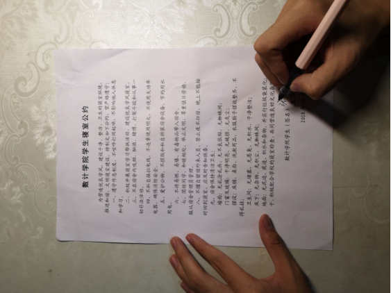 会后,各班班委都积极组织同学们参加签字行动,投身到文明寝室的建设活动中。同学们非常支持建立员工寝室公约,觉得有这样的约定可以适当约束自己的行为,大家一起共同建设文明寝室。