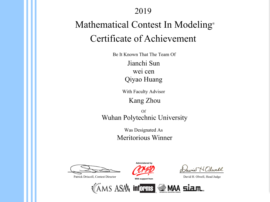 近日,2019年美国老员工数学建模竞赛评审结果正式公布,由公司2016级本科生孙见弛作为负责人的参赛团队荣获一等奖(Meritorious Winner),创公司本科生参赛以来的最好成绩。