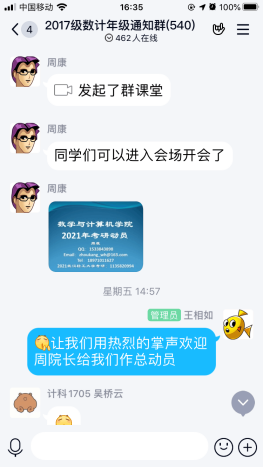 7月10日下午,本着“早介入、稳推进、速行动、广受益”的策略,3044am永利集团通过“QQ群课堂”,面向2017级510位2021届毕业生,召开了考研专题动员大会,公司副经理周康教授主讲,2017级辅导员王相如老师主持了动员会。