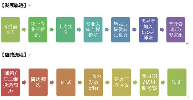 你可以享受CEO亲临授课,成为企业管理层重点培养人才之一,公司将安排你到各个岗位实训磨练,考核通过即可直接晋升为公司管理层!