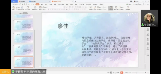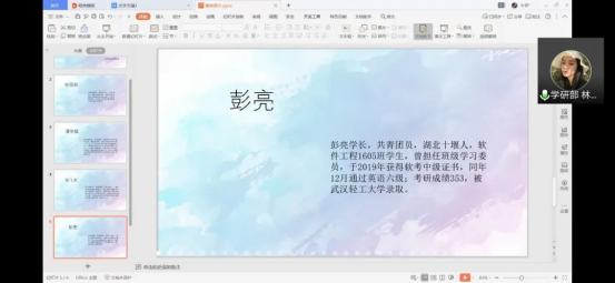 廖佳同学用自己从浑浑噩噩度日到踌躇满志备考的改变告诉考研的同学们——环境的重要性,跟公司自习室、图书馆比较起来,寝室和家里的干扰因素太多,并不适合复习备考。她也结合自身择校经历,建议大家有时选择比盲目努力更加重要,说起去年冬季想要放弃时朋友的鼓励,廖佳深情感慨,令人动容。最后,她和团学干部分享了自己备考时的资料和网课视频,勉励同学们努力学习。