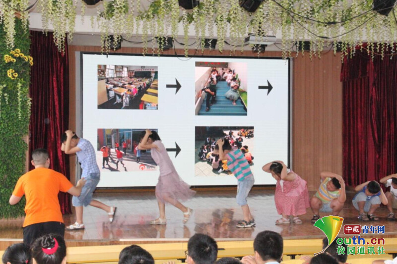 课堂上,为了帮助同学们能掌握逃生技能,午晨旭将他们带上讲台,模拟遇灾时的正确自救方法。